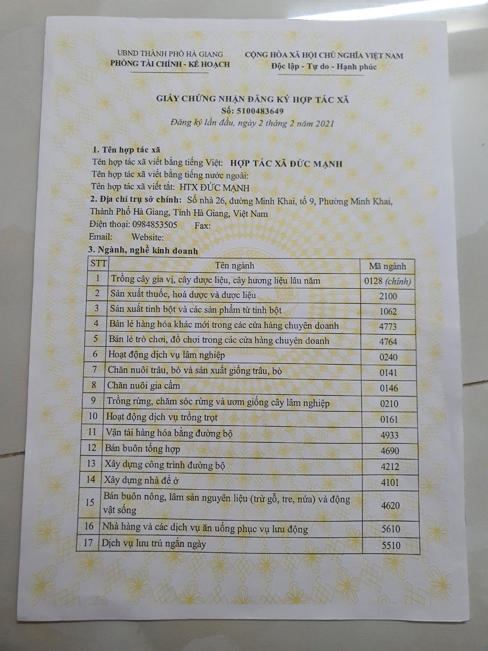 | Địa chỉ | Số nhà 26 đường Minh Khai tổ 9 phường Minh Khai thành phố Hà giang tỉnh Hà Giang |